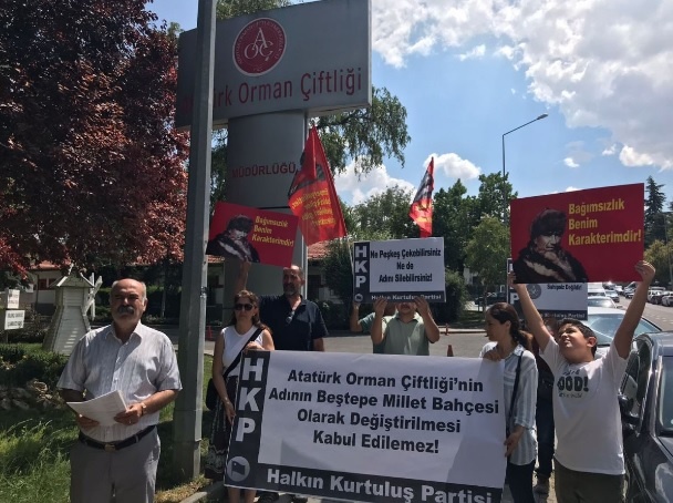 Atatürk Orman Çiftliği Müdürlüğü önünde bir araya gelen HKP üyeleri, “Atatürk Orman Çiftliği’nin adının Beştepe Millet Ormanı olarak değiştirilmesi kabul edilemez” yazılı pankart ve “Atatürk Orman Çiftliği sahipsiz değildir”, “Ne peşkeş çekebilirsiniz, ne de adını silebilirsiniz” yazılı dövizler taşıdı.