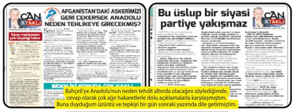 Korkusuz gazetesi yazarı Can Ataklı, bugünkü yazısında AKP Genel Başkanı ve Cumhurbaşkanı Recep Tayyip Erdoğan’ın Afganistan kararını kaleme aldı. Ataklı, Bahçeli’nin geçen haftaki konuşmasını hatırlatarak “hakaret eden MHP’liler şimdi ne yapacak?” dedi.