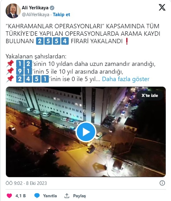 İçişleri Bakanı Yerlikaya, ‘Kahramanlar’ operasyonları kapsamında tüm Türkiye’de yapılan operasyonlarda arama kaydı bulunan 2 bin 554 firarinin yakalandığını duyurdu.