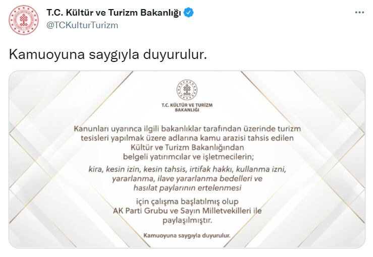 “Kanunları uyarınca ilgili bakanlıklar tarafından üzerinde turizm tesisleri yapılmak üzere adlarına kamu arazisi tahsis edilen Kültür ve Turizm Bakanlığı’ndan belgeli yatırımcılar ve işletmecilerin; kira kesin izini kesin tahsis, irtifak hakkı, kullanma izni, yaralanma, ilave yararlanma bedelleri ve hasılat paylarının ertelenmesi için çalışma başlatılmış olup, AK Parti Grubu ve Sayın Milletvekilleri ile paylaşılmıştır.”