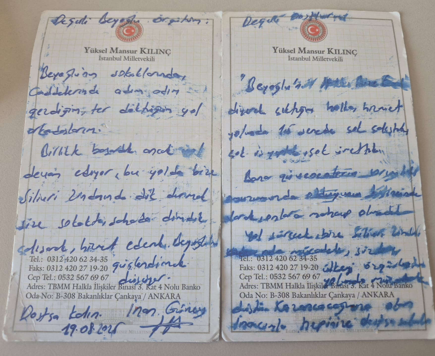 Beyoğlu Belediye Başkanı İnan Güney, kendisini cezaevinde ziyaret eden CHP İstanbul Milletvekili Yüksel Mansur Kılınç aracılığı ile kamuoyuna ve CHP Beyoğlu örgütüne kendi el yazısı ile gönderdiği mesajlarla seslendi.