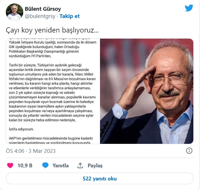 İYİ Parti Genel İdare Kurulu Üyesi Bülent Gürsoy, İYİ Parti Genel Başkanı Meral Akşener’in CHP Genel Başkanı Kemal Kılıçdaroğlu’nun cumhurbaşkanı adaylığını desteklemeyeceğini açıklamasının ardından partideki görevinden istifa etti. Kılıçdaroğlu’nun adaylığını destekleyeceğini açıklayan Gürsoy, “Çayı koy yeniden başlıyoruz..” dedi.
