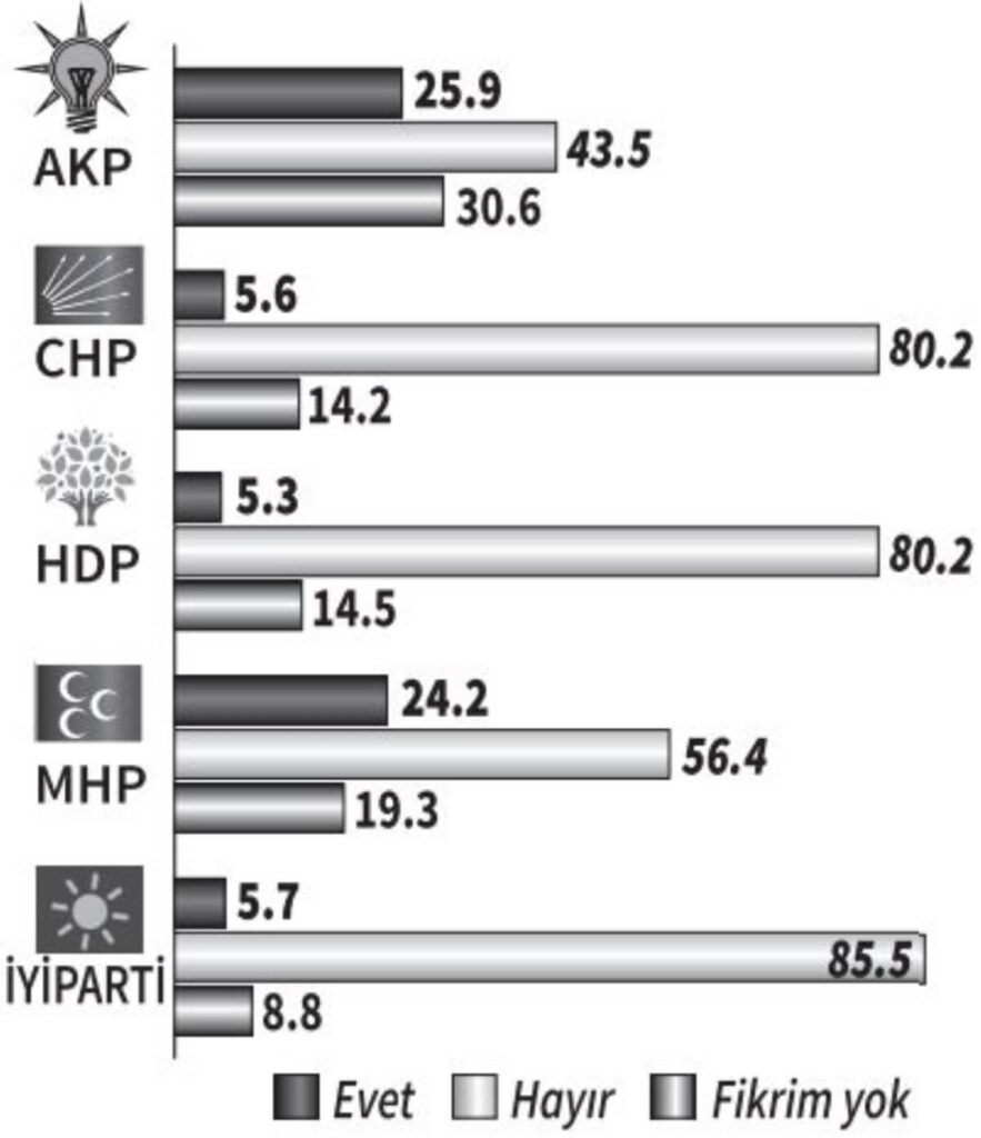 Araştırmanın öne çıkan bir diğer sonucu ise ankete katılan AKP seçmeninin yüzde 43.5’inin ve MHP seçmeninin yüzde 56.4’ünün Gezi protestoları sırasında cami yakıldığını düşünmediklerini ifade etmesi oldu.