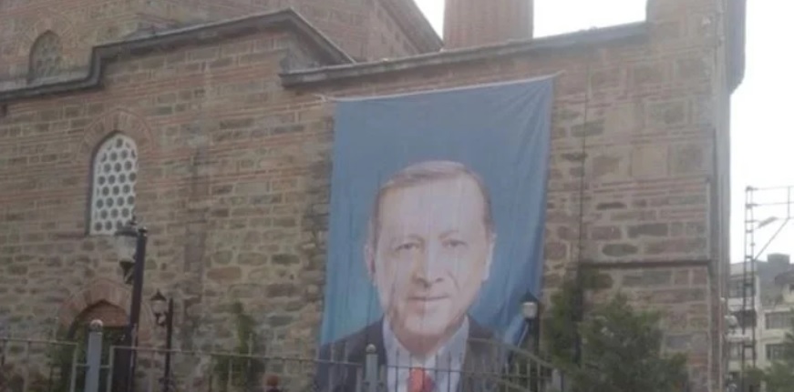 İYİ Parti Bursa İl Başkanı Mehmet Hasanoğlu’nun sosyal medya hesabından paylaştığı fotoğrafa göre, ilçeye bağlı Kayhan Mahallesi’nde bulunan Ahmet Dai Cami’nin duvarına Cumhurbaşkanı Recep Tayyip Erdoğan’ın fotoğrafı asıldı.