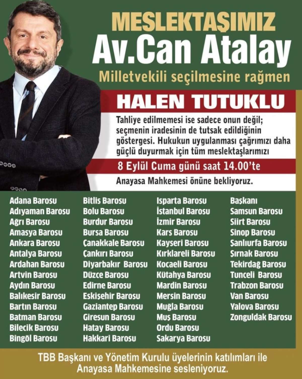 “Meslektaşımız Av. Can Atalay milletvekili seçilmesine rağmen halen tutuklu. Tahliye edilmemesi sadece onun değil, seçmenin iradesinin de tutsak edildiğinin göstergesi. Hukukun uygulanması çağrımızı daha güçlü duyurmak için 8 Eylül Cuma günü saat 14.00’te Anayasa Mahkemesi önüne bekliyoruz.”