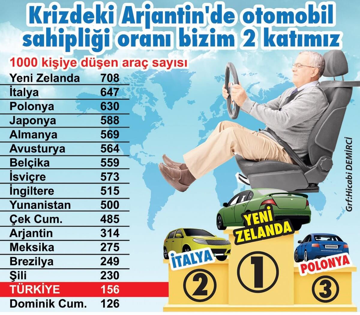 Cumhurbaşkanı Tayyip Erdoğan önceki akşam yaptığı konuşmada, “Her evde, kapıcısında araba var, araç yetişmiyor” dedi ancak rakamlar öyle söylemiyor. Türkiye’de 100 kişiye düşen otomobil sayısı 15. Avrupa Birliği ortalamasına göre bu rakam 56. Arjantin’de 100 kişiden 31’i, Meksika’da dahi 27’si otomobil sahibi iken, Türkiye otomobil sahipliğinde Afrika ülkelerinin hemen üzerinde en diplerde yer alıyor.