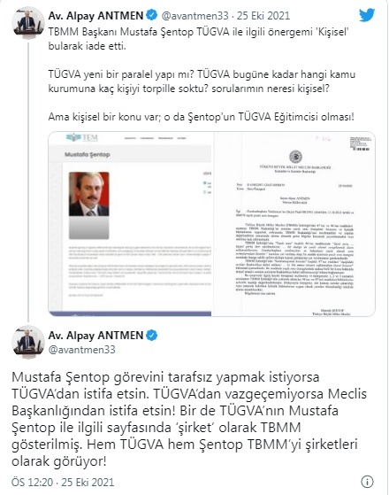 CHP’li Antmen’den ise yanıt gecikmedi. Sosyal medya hesabından paylaşım yapan Antmen, “TBMM Başkanı Mustafa Şentop TÜGVA ile ilgili önergemi ‘Kişisel’ bularak iade etti.TÜGVA yeni bir paralel yapı mı? TÜGVA bugüne kadar hangi kamu kurumuna kaç kişiyi torpille soktu? sorularımın neresi kişisel? Ama kişisel bir konu var; o da Şentop’un TÜGVA Eğitimcisi olması!” ifadelerini kullandı.