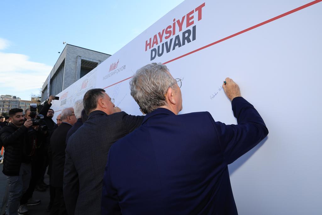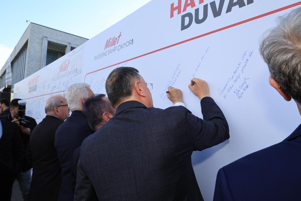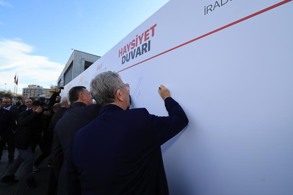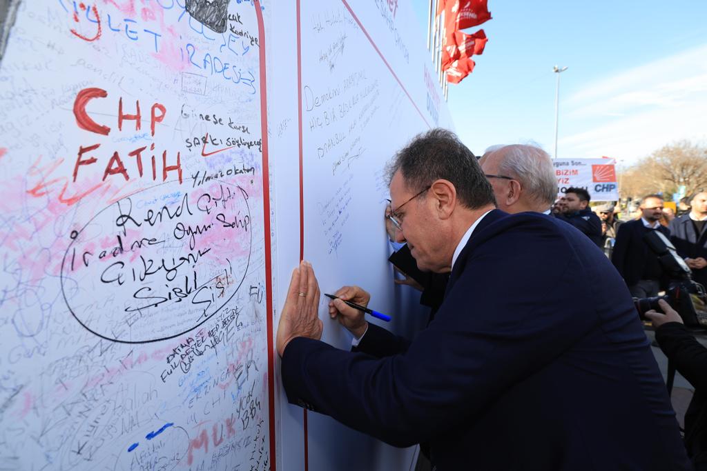 CHP Genel Başkan Yardımcısı Seyit Torun ve Millet İttifakı’na mensup CHP’li Büyükşehir Belediye Başkanları, hakkında hapis ve siyasi yasak kararı verilen İstanbul Büyükşehir Belediye (İBB) Başkanı Ekrem İmamoğlu’na destek olmak amacıyla Saraçhane’de buluştu. Torun ile Büyükşehir Belediye Başkanları Mansur Yavaş (Ankara), Tunç Soyer (İzmir), Osman Gürün (Muğla), Kadir Albayrak (Tekirdağ), Özlem Çerçioğlu (Aydın), Muhittin Böcek (Antalya), Zeydan Karalar (Adana), Vahap Seçer (Mersin) ve Lütfü Savaş (Hatay), CHP İl Gençlik Kolları tarafından İBB ana yerleşkesinin önünde konumlandırılan “Haysiyet Duvarı”nın önünde buluştu. “Haysiyet Duvarı”na imza atan ve duygularını aktaran heyet, anı fotoğrafı çektirdi.