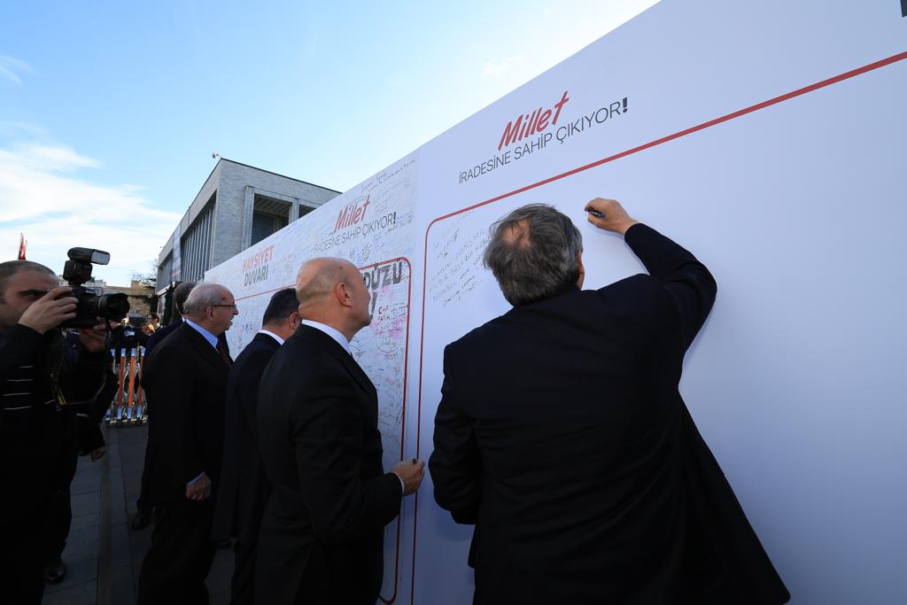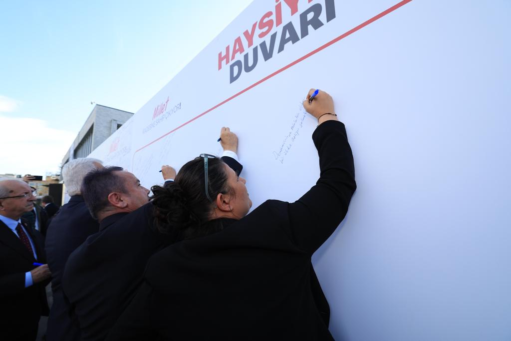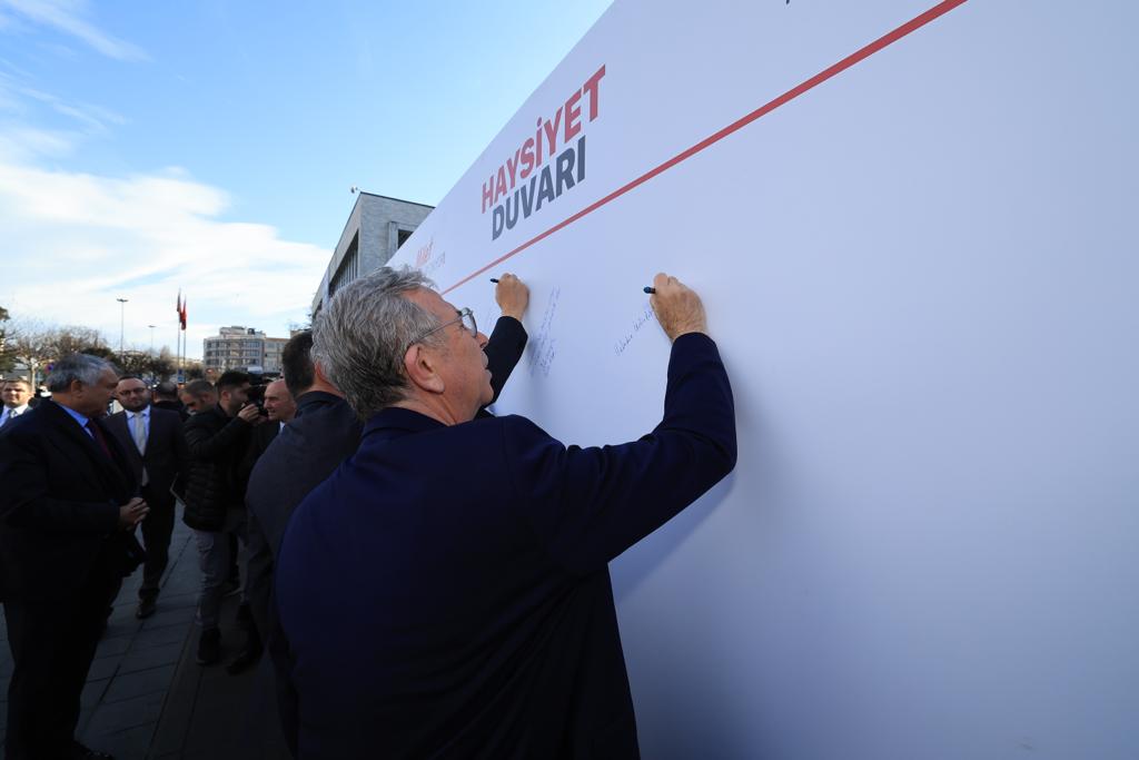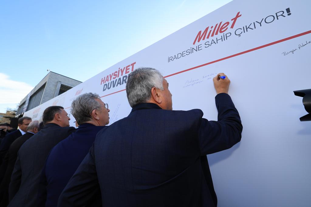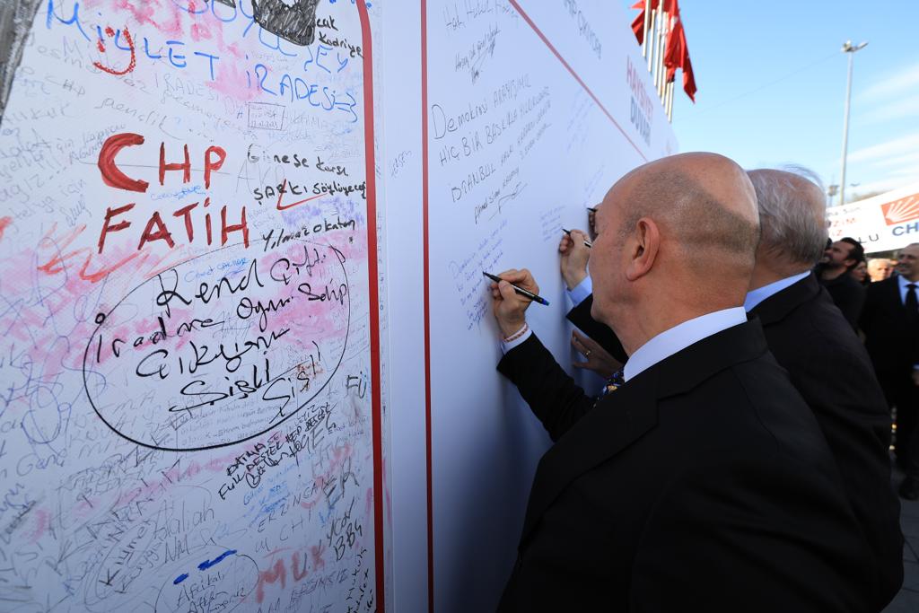 CHP Genel Başkan Yardımcısı Seyit Torun ve Millet İttifakı’na mensup CHP’li Büyükşehir Belediye Başkanları, hakkında hapis ve siyasi yasak kararı verilen İstanbul Büyükşehir Belediye (İBB) Başkanı Ekrem İmamoğlu’na destek olmak amacıyla Saraçhane’de buluştu. Torun ile Büyükşehir Belediye Başkanları Mansur Yavaş (Ankara), Tunç Soyer (İzmir), Osman Gürün (Muğla), Kadir Albayrak (Tekirdağ), Özlem Çerçioğlu (Aydın), Muhittin Böcek (Antalya), Zeydan Karalar (Adana), Vahap Seçer (Mersin) ve Lütfü Savaş (Hatay), CHP İl Gençlik Kolları tarafından İBB ana yerleşkesinin önünde konumlandırılan “Haysiyet Duvarı”nın önünde buluştu. “Haysiyet Duvarı”na imza atan ve duygularını aktaran heyet, anı fotoğrafı çektirdi.