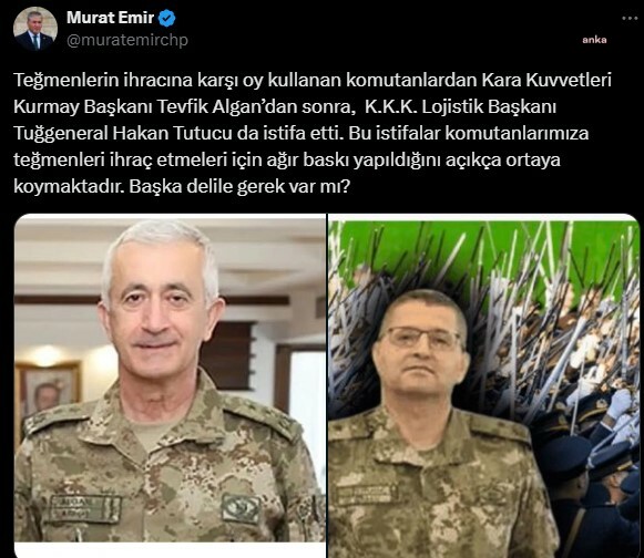“Teğmenlerin ihracına karşı oy kullanan komutanlardan Kara Kuvvetleri Kurmay Başkanı Tevfik Algan’dan sonra, K.K.K. Lojistik Başkanı Tuğgeneral Hakan Tutucu da istifa etti. Bu istifalar komutanlarımıza teğmenleri ihraç etmeleri için ağır baskı yapıldığını açıkça ortaya koymaktadır. Başka delile gerek var mı?”