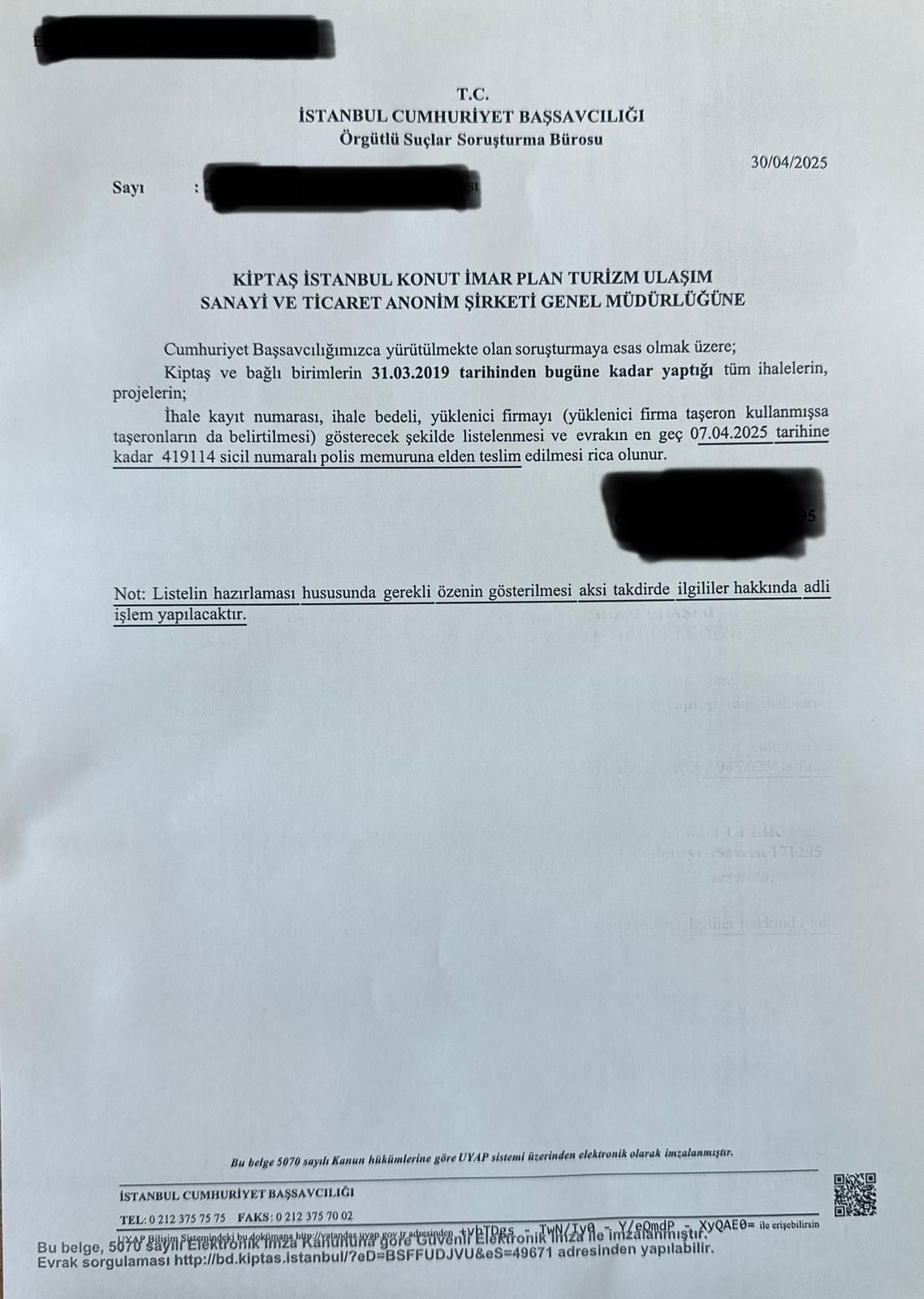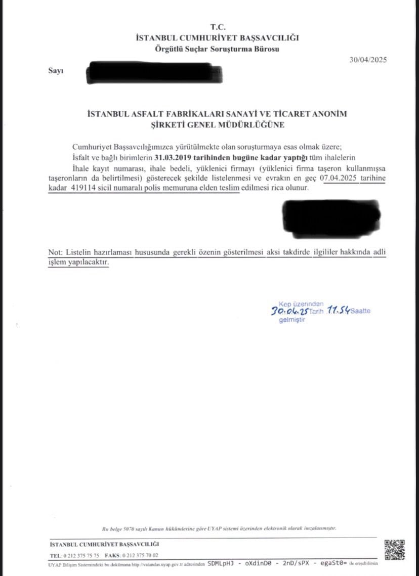 Günaydın, sosyal medya hesabından yaptığı açıklamada, “İBB iştirak şirketleri olan İSFALT ve KİPTAŞ’a İstanbul Cumhuriyet Başsavcılığı Örgütlü Suçlar Bürosundan iki ayrı yazı geldiğini” bildirerek, şunları kaydetti: