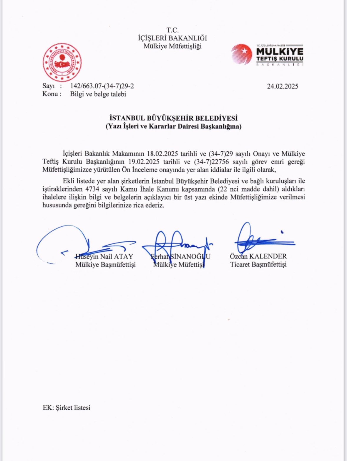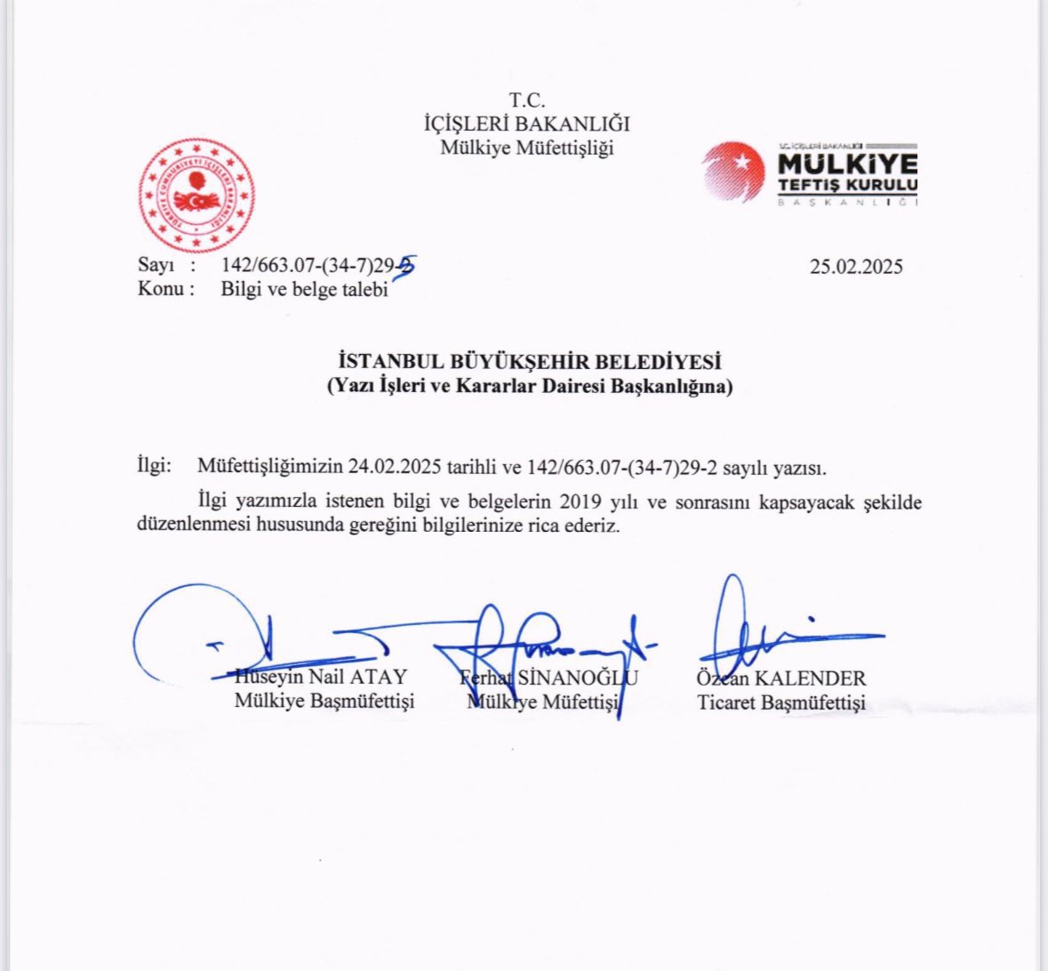 Ancak bununla yetinmeyelim, inceleme ve denetim aşamasına ilişkin ibretlik bir örnek daha verelim. Bu kez İBB’de denetimde olan mülkiye müfettişleri, 24 Şubat 2025 tarihli yazı ile İBB’den 14 şirketin ihale evraklarını istiyorlar. Bu şirketlerin 6 tanesinin 2019 yılından önce de (AK Parti döneminde de) ihale aldıkları ortaya çıkınca, ertesi gün telaşla yazdıkları yazıyla 2019 sonrası dosyaların istendiğini belirtip, milat (2019) öncesi dosyalara bak(a)mayacaklarını itiraf etmiş oluyorlar.