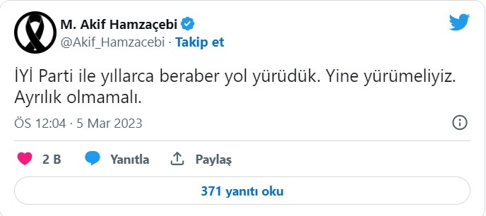 Hamzaçebi, “İYİ Parti ile yıllarca beraber yol yürüdük. Yine yürümeliyiz. Ayrılık olmamalı” ifadesini kullandı.