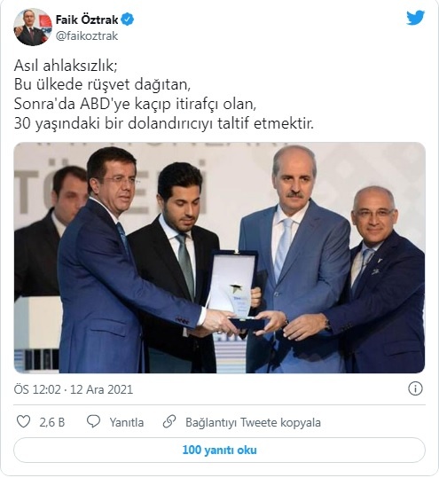 Sosyal medya hesabından Kurtulmuş’un Rıza Sarraf ise fotoğrafını paylaşan Öztrak, “Asıl ahlaksızlık; Bu ülkede rüşvet dağıtan, Sonra’da ABD’ye kaçıp itirafçı olan, 30 yaşındaki bir dolandırıcıyı taltif etmektir” dedi.