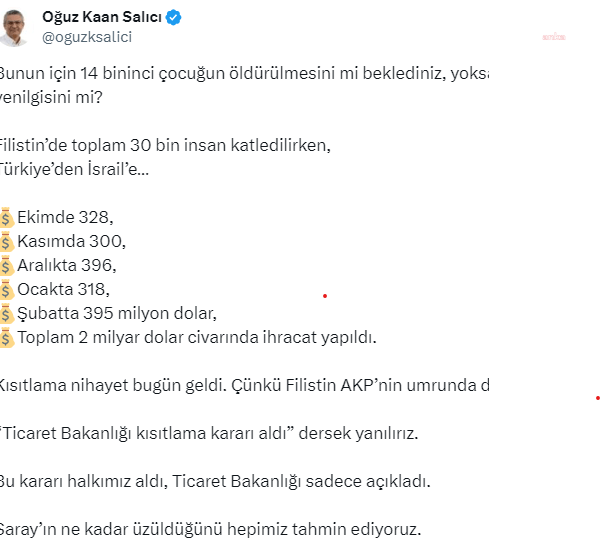 CHP İstanbul Milletvekili Oğuz Kaan Salıcı, Ticaret Bakanlığı’nın, savaşın başlamasından 6 ay sonra İsrail ile ihracatın kısıtlanması kararına ilişkin; “Bunun için 14 bininci çocuğun öldürülmesini mi beklediniz, yoksa seçim yenilgisini mi. Bu kararı halkımız aldı, Ticaret Bakanlığı sadece açıkladı. Saray’ın ne kadar üzüldüğünü hepimiz tahmin ediyoruz” değerlendirmesini yaptı.