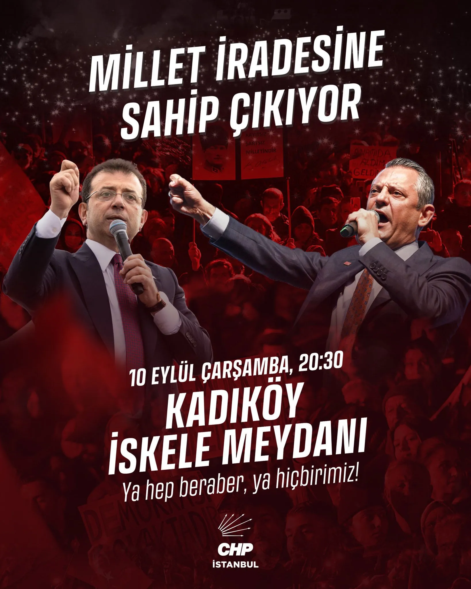 Mitingi duyuran CHP İstanbul İl Başkanı Özgür Çelik, sosyal medya hesabından yaptığı açıklamada, “Adalete, demokrasiye ve partimize sahip çıkıyoruz. Cumhurbaşkanı Adayımız Ekrem İmamoğlu’na, belediye başkanlarımıza ve tüm yol arkadaşlarımıza özgürlük demek için Genel Başkanımız Özgür Özel öncülüğünde buluşuyoruz.” dedi.