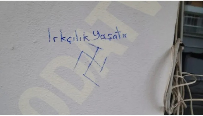 CHP İzmir İl Başkanlığı binasının ana giriş kapısındaki sağ ve sol sütunlarına “CHP artık Atatürk’ün partisi değil, Kahrolsun HDP kahrolsun PKK, Irkçılık yaşatır” yazıldı ve ırkçılığı simgeleyen “gamalı haç” çizildi.