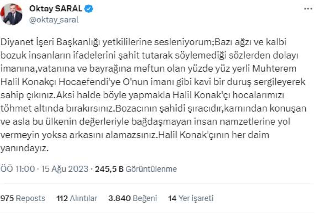 “Diyanet İşleri Başkanlığı yetkililerine sesleniyorum; Bazı ağzı ve kalbi bozuk insanların ifadelerini şahit tutarak söylemediği sözlerden dolayı imanına, vatanına ve bayrağına meftun olan yüzde yüz yerli Muhterem Halil Konakcı Hocaefendi’ye onun imanı gibi kavi bir duruş sergileyerek sahip çıkınız. Aksi halde böyle yapmakla Halil Konakcı hocalarımızı töhmet altında bırakırsınız. Bozacının şahidi şıracıdır, karnından konuşan ve asla bu ülkenin değerleriyle bağdaşmayan insan namzetlerine yol vermeyin yoksa arkasını alamazsınız. Halil Konakcı’nın her daim yanındayız.”