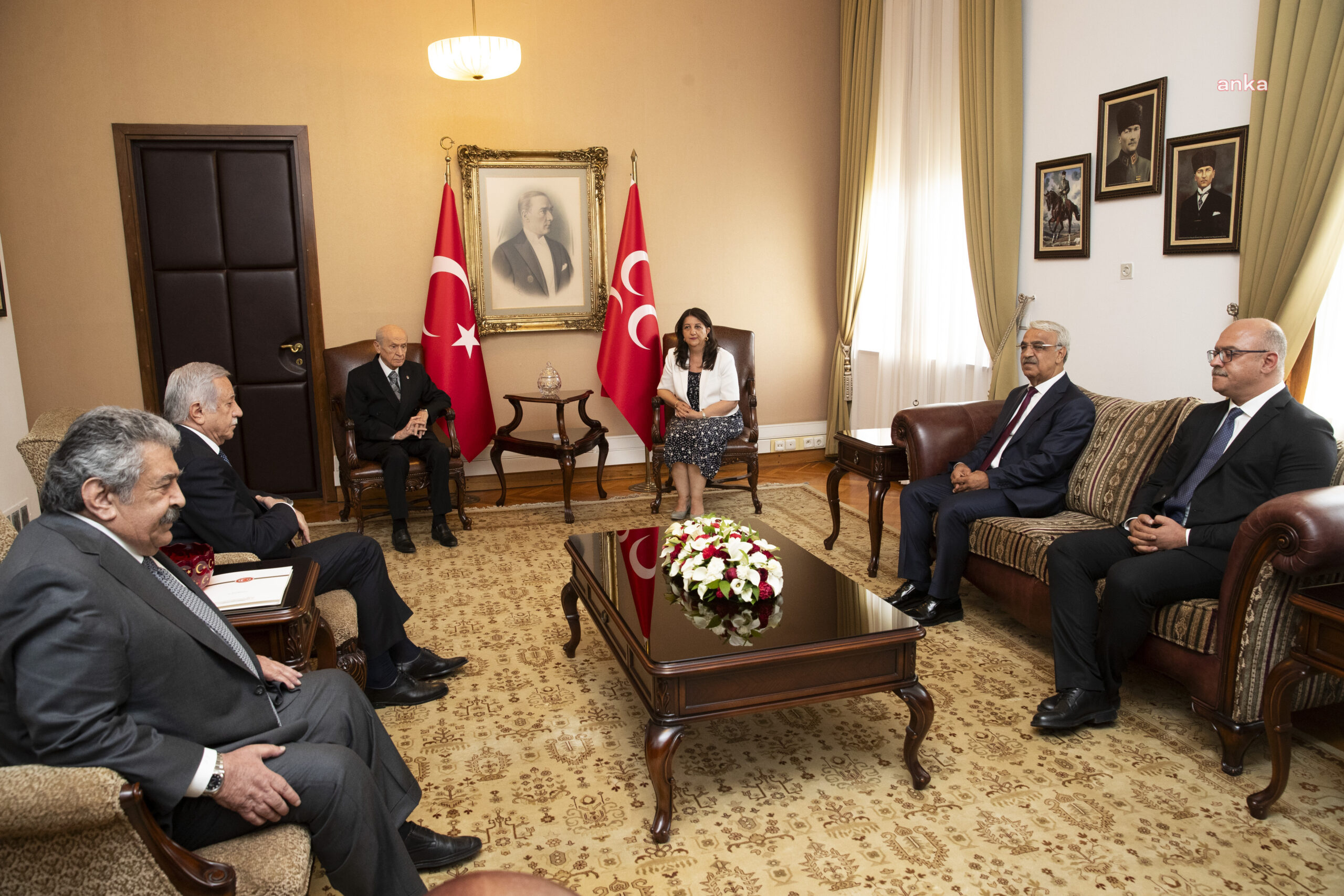 DEM Parti İmralı Heyeti, MHP Genel Başkanı Devlet Bahçeli’yi TBMM MHP Grubu’ndaki makamında ziyaret etti. Heyet Üyesi Pervin Buldan, yaklaşık 40 dakika süren görüşmenin ardından çok önemli bir görüşme yaptıklarını belirterek, “Komisyon aşamasında da birbirimize ihtiyacımız var, istişareye ihtiyaç var ve ortak bir tutuma ihtiyaç var kanaatini taşıyoruz” dedi. Bahçeli ise görüşmeye dair açıklama yapıp yapmayacağını soran gazetecilere “Ben ahrazım” cevabını verdi.