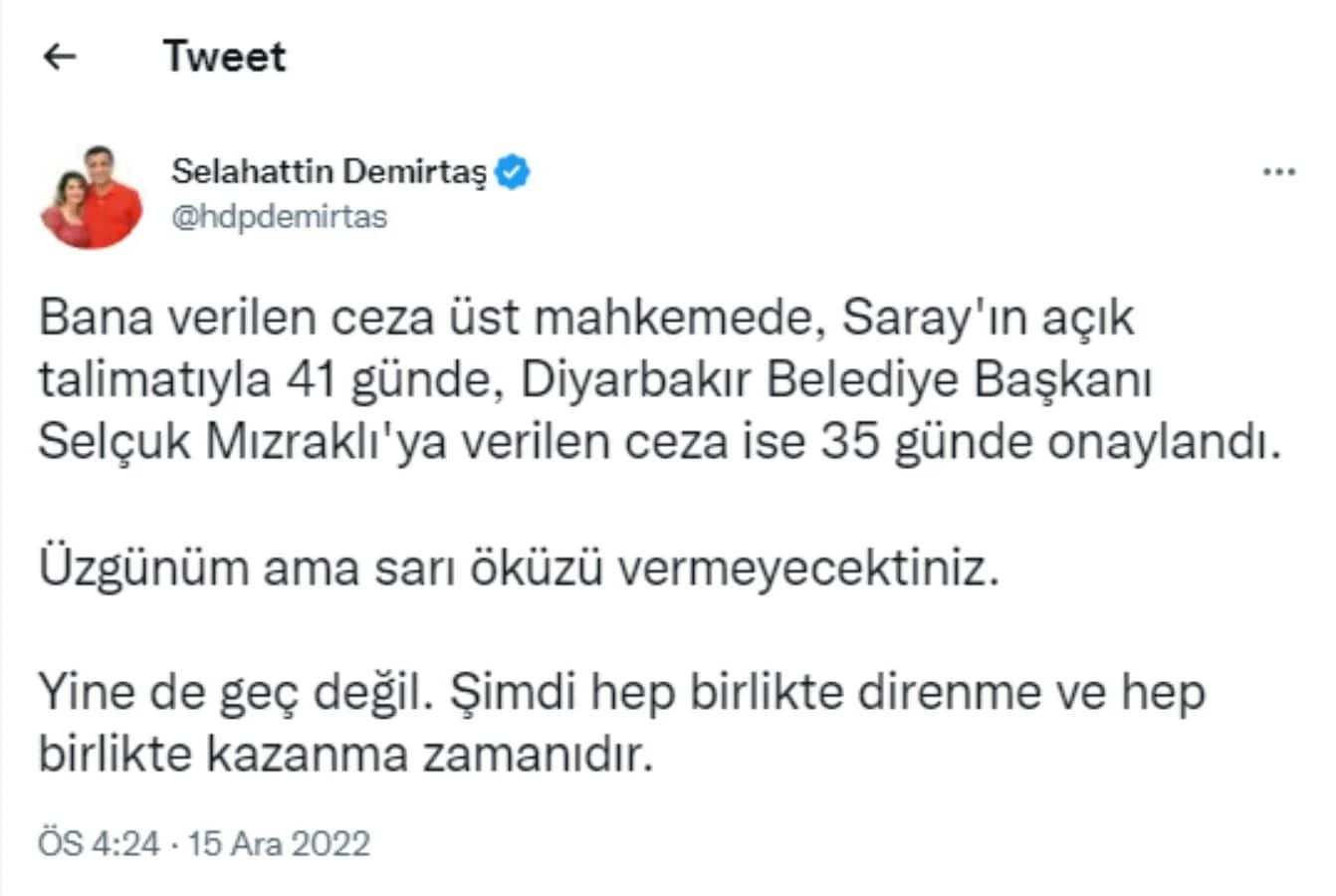 Diyarbakır Belediye Başkanı Selçuk Mızraklı ve kendisine verilen cezaların onaylanma sürelerini hatırlatan Demirtaş mesajında, “Bana verilen ceza üst mahkemede, Saray’ın açık talimatıyla 41 günde, Diyarbakır Belediye Başkanı Selçuk Mızraklı’ya verilen ceza ise 35 günde onaylandı. Üzgünüm ama sarı öküzü vermeyecektiniz. Yine de geç değil. Şimdi hep birlikte direnme ve hep birlikte kazanma zamanıdır” dedi.