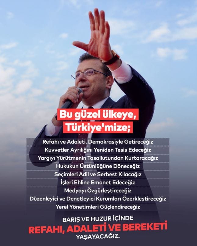 Tutuklu Cumhurbaşkanı Adayı ve İBB Başkanı Ekrem İmamoğlu, vaatlerini sosyal medya hesabı üzerinden tek tek açıkladı. Göreve geldiğinde refahı ve adaleti yeniden tesis edeceklerinden bahseden İmamoğlu, "Barış ve huzur içinde refahı, adaleti ve bereketi yaşayacağız." dedi.