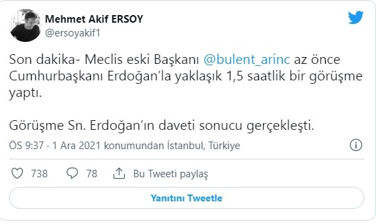 “Meclis eski Başkanı Bülent Arınç az önce Cumhurbaşkanı Erdoğan’la yaklaşık 1,5 saatlik bir görüşme yaptı. Görüşme Sn. Erdoğan’ın daveti sonucu gerçekleşti.”