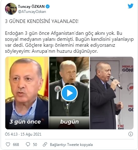 CHP İzmir Milletvekili Tuncay Özkan, konuyla ilgili Twitter’dan yaptığı paylaşımda, “Erdoğan 3 gün önce Afganistan’dan göç akını yok. Bu sosyal medyanın yalanı demişti. Bugün kendisini yalanlayıp var dedi. Göçlere karşı önlemini merak ediyorsanız söyleyeyim: Avrupa’nın huzuru düşünüyor.” ifadelerini kullandı.