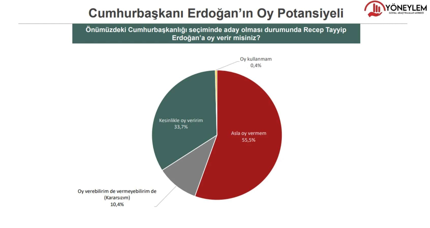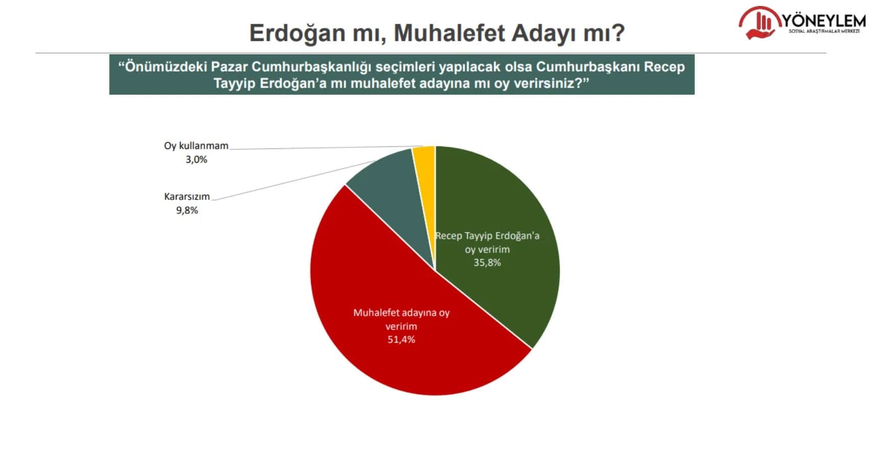 Cumhuriyet’ten Rengin Temoçin‘in haberine göre; “Önümüzdeki pazar cumhurbaşkanlığı seçimleri yapılacak olsa Erdoğan’a mı muhalefet adayına mı oy verirsiniz” sorusuna yurttaşların yüzde 51.4’ü “Muhalefet adayına oy veririm”, yüzde 35.8’i “Erdoğan’a oy veririm” dedi. Yüzde 9.8’si “kararsız” olduğunu söylerken yüzde 3’lük bir kesim “Oy kullanmam” yanıtını verdi.