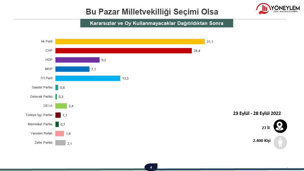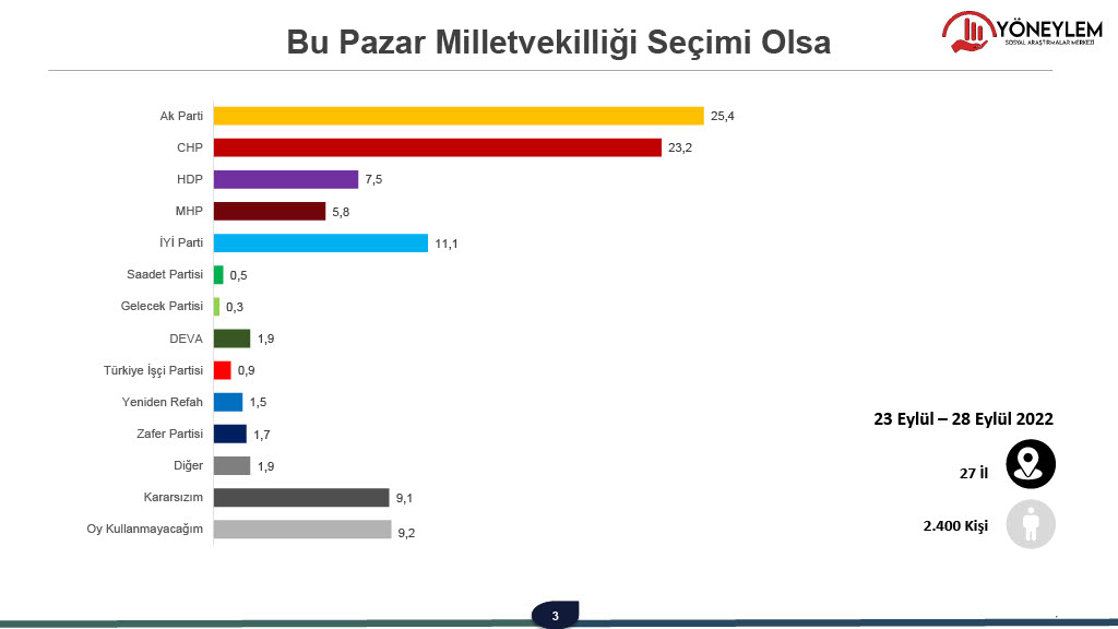 Yöneylem Araştırma’nın 26 – 30 Eylül tarihleri arasında 2400 kişi ile 27 ilde gerçekleştirdiği anketinin sonuçları açıklandı. Ankette katılımcılara seçmenin tercihlerinden ülkenin sorunlarına kadar birçok soru soruldu.