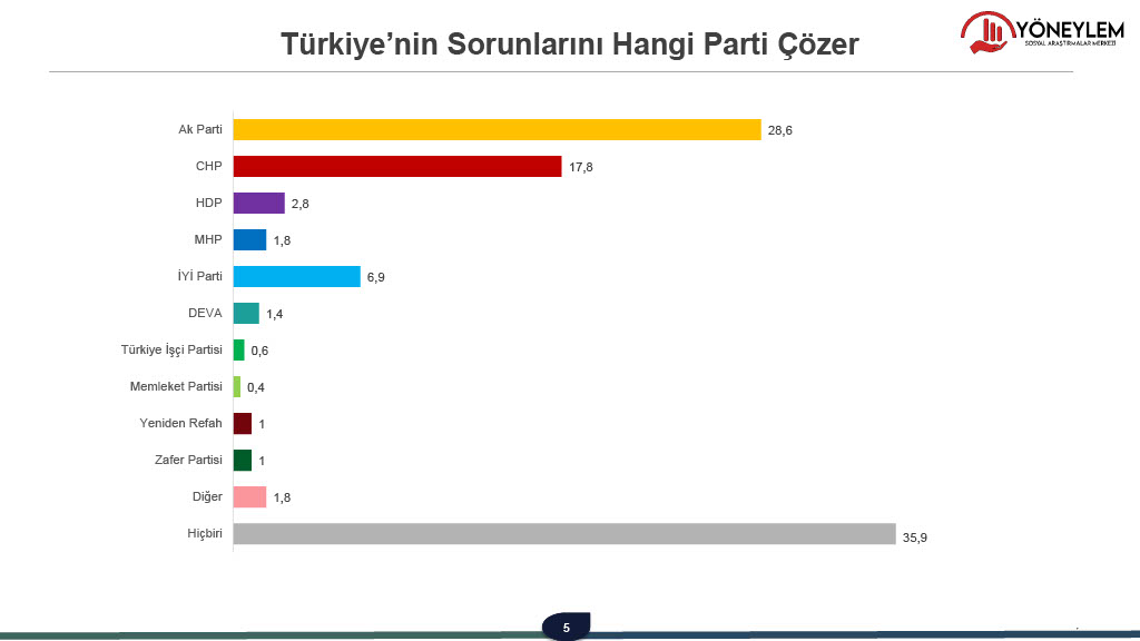 Katılımcılara “Türkiye’nin sorunlarını kim çözer?” sorusu yöneltildi. Ankete katılanlardan yüzde 28.6’sı sorunları AKP’nin çözeceğini söylerken yüzde 17.8’i CHP’nin çözeceğini ifade etti. Aynı soruya katılımcıların yüzde 6.9’u İYİ Parti, yüzde 1.8’i MHP yanıtını verdi. Hiçbiri cevabını verenlerin oranı ise yüzde 35.9’u buldu.