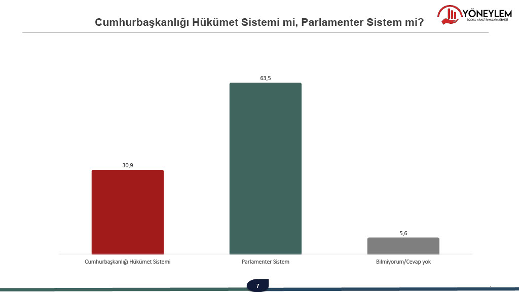 Seçmene “Cumhurbaşkanlığı sistemi mi parlamenter sistem mi?” sorusu yöneltildi. Seçmenin yüzde 63.5’i parlamenter sistemi tercih ederken cumhurbaşkanlığı sistemini seçenlerin oranı sadece yüzde 30.9’da kaldı.