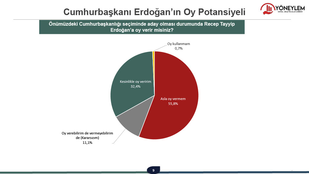 Seçmene cumhurbaşkanlığı seçimlerinde Erdoğan’a oy verip vereceği soruldu. “Erdoğan’a asla oy vermem” diyenlerin oranı zirveye ulaşarak yüzde 55.8 olarak ölçüldü. “Kesinlikle oy veririm” diyenlerin oranı ise yüzde 32.4 olarak belirlendi.