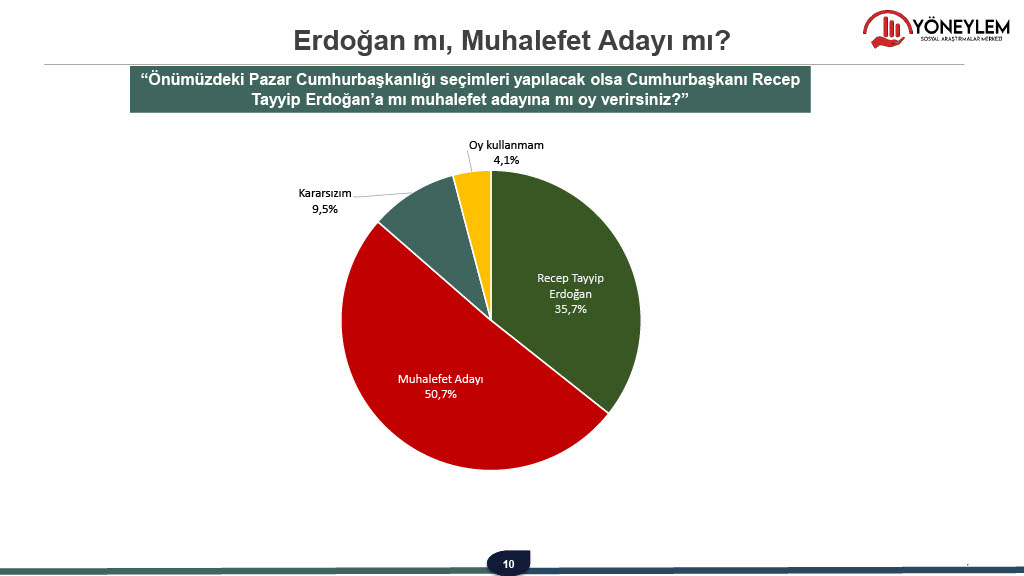 Seçmene “Erdoğan mı muhalefet adayı mı?” sorusu yöneltildi. Seçmenin yüzde 50.7’si muhalefet adayını seçerken yüzde 35.7’si ise Erdoğan’ı tercih edeceğini söyledi. Kararsızların oranı ise yüzde 9.5 olarak ölçüldü.