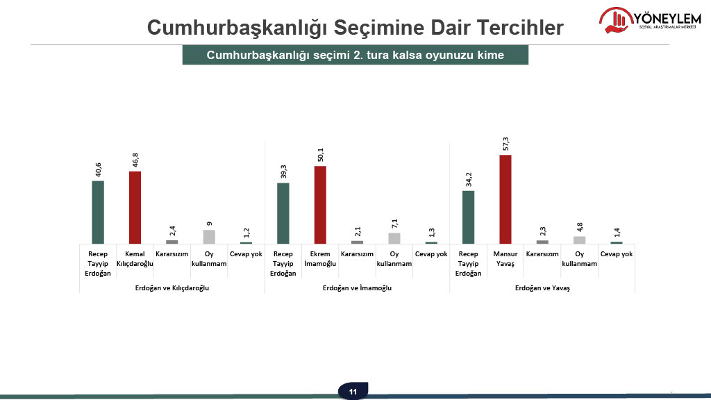 Erdoğan’ın karşısında Kılıçdaroğlu, İmamoğlu ve Mansur Yavaş’ın aday olarak çıkarıldığı senaryolar seçmene soruldu. Seçmenin en büyük desteği Mansur Yavaş’a verdiği görülürken, Kılıçdaroğlu’nun aday olması durumunda Erdoğan’a 6 puan fark attığı görüldü.