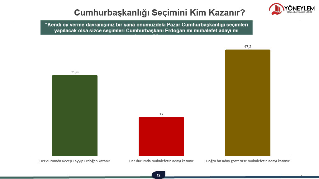 Seçmen, cumhurbaşkanlığı seçimi ile ilgili de muhalefetin kazanacağı umudunu taşıdığını gösterdi. “Seçimi kim kazanır?” sorusunda “Doğru aday gösterirse muhalefet” diyenlerin oranı yüzde 47.2 olurken Erdoğan diyenlerin oranı yüzde 35.8 oldu.
