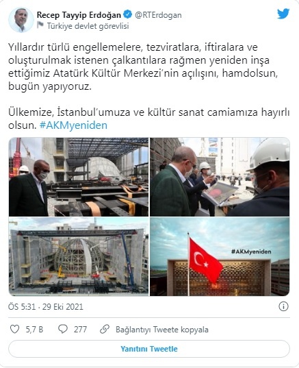 Cumhurbaşkanı Recep Tayyip Erdoğan, Gezi Parkı Protestoları sonrasında sıkça hedef aldığı Taksim’in simgesi AKM’nin açılışına dair bazı fotoğraflar paylaşarak, “Yıllardır türlü engellemelere, tezviratlara, iftiralara ve oluşturulmak istenen çalkantılara rağmen yeniden inşa ettiğimiz Atatürk Kültür Merkezi’nin açılışını, hamdolsun, bugün yapıyoruz. Ülkemize, İstanbul’umuza ve kültür sanat camiamıza hayırlı olsun” dedi.