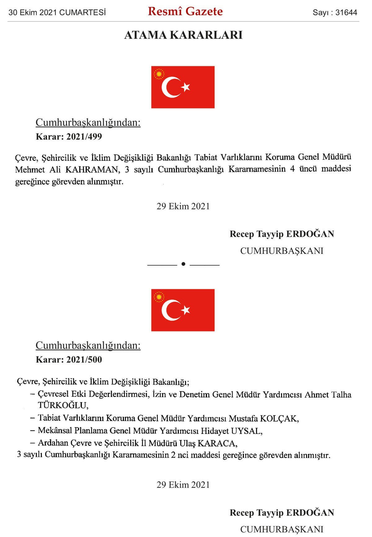 Çevre, Şehircilik ve İklim Değişikliği Bakanlığı Tabiat Varlıklarını Koruma Genel Müdürü Mehmet Ali KAHRAMAN, 3 sayılı Cumhurbaşkanlığı Kararnamesinin 4 üncü maddesi gereğince görevden alınmıştır.