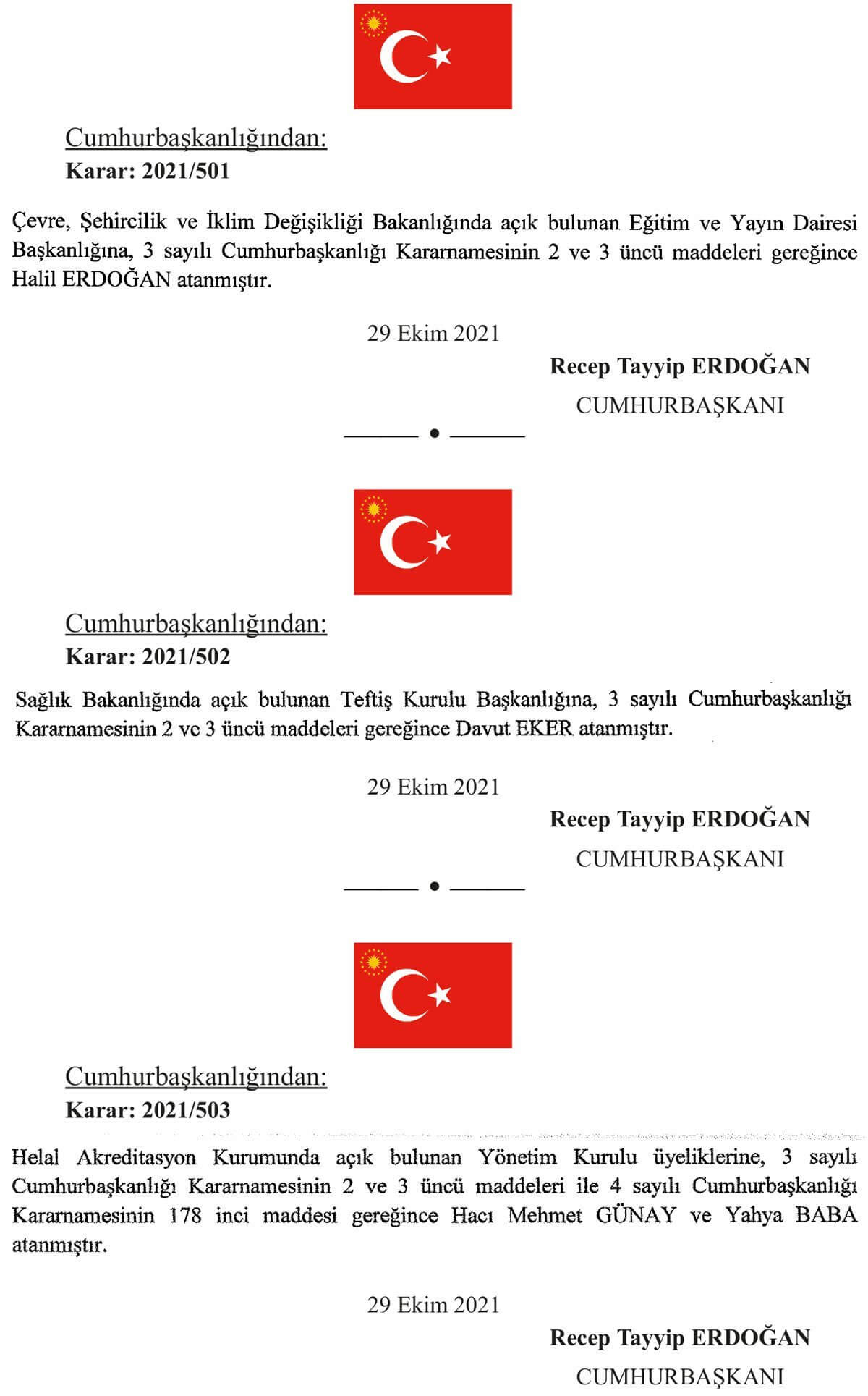 Helal Akreditasyon Kurumunda açık bulunan Yönetim Kurulu üyeliklerine, 3 sayılı Cumhurbaşkanlığı Kararnamesinin 2 ve 3 üncü maddeleri ile 4 sayılı Cumhurbaşkanlığı Kararnamesinin 178 inci maddesi gereğince Hacı Mehmet GÜNAY ve Yahya BABA atanmıştır.