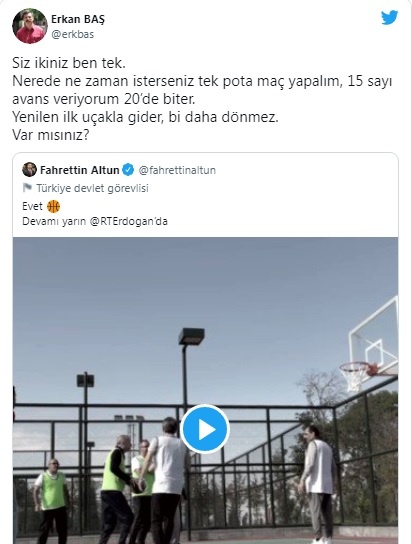 Baş, Altun’un tweetini alıntılayarak, “Siz ikiniz ben tek. Nerede ne zaman isterseniz tek pota maç yapalım, 15 sayı avans veriyorum 20’de biter. Yenilen ilk uçakla gider, bi daha dönmez. Var mısınız?” dedi.