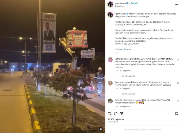 İYİ Parti Hatay milletvekili adayı Gökhan Zan seçim afişlerinin indirilmesine tepki göstererek, "Memleketimizde böyle bir ekibi deprem haftasında da görmek isterdik. Benden bu kadar korkmayın" dedi.