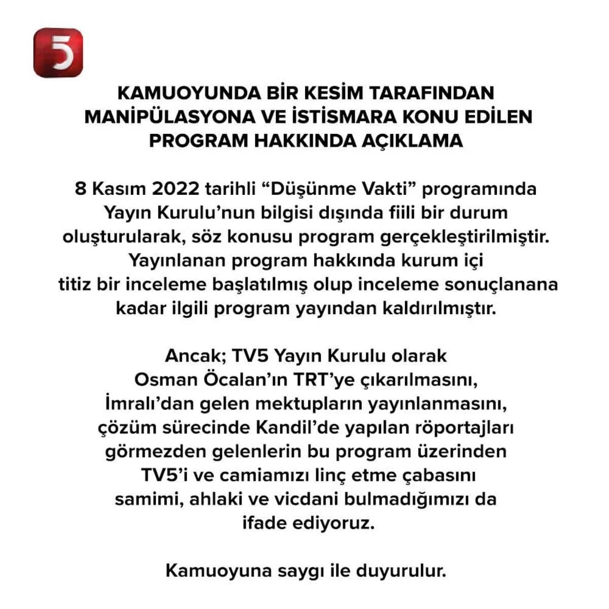 Açıklamanın devamında  “Ancak; TV5 Yayın Kurulu olarak Osman Öcalan’ın TRT’ye çıkarılmasını, İmralı’dan gelen mektupların yayınlanmasını, çözüm sürecinde Kandil’de yapılan röportajları görmezden gelenlerin bu program üzerinden TV5’i ve camiamızı linç etme çabasını samimi, ahlaki ve vicdani bulmadığımızı da ifade ediyoruz” vurgusu yapıldı.