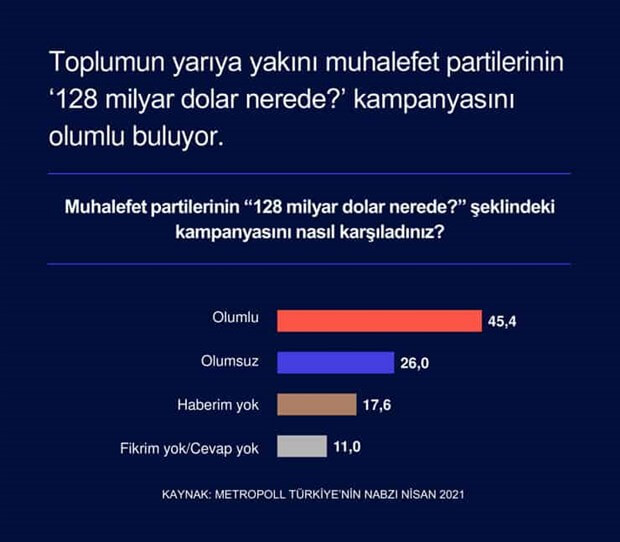 Araştırmada, “Muhalefet partilerinin ‘128 milyar dolar nerede?’ şeklindeki kampanyasını nasıl karşıladınız?” sorusuna yüzde 45,4 oranında ‘Olumlu’ yanıtı verildi. Yüzde 26 ‘Olumsuz’, yüzde 17 ‘Haberim yok’, yüzde 11 de ‘Fikrim yok’ cevabını verdi.