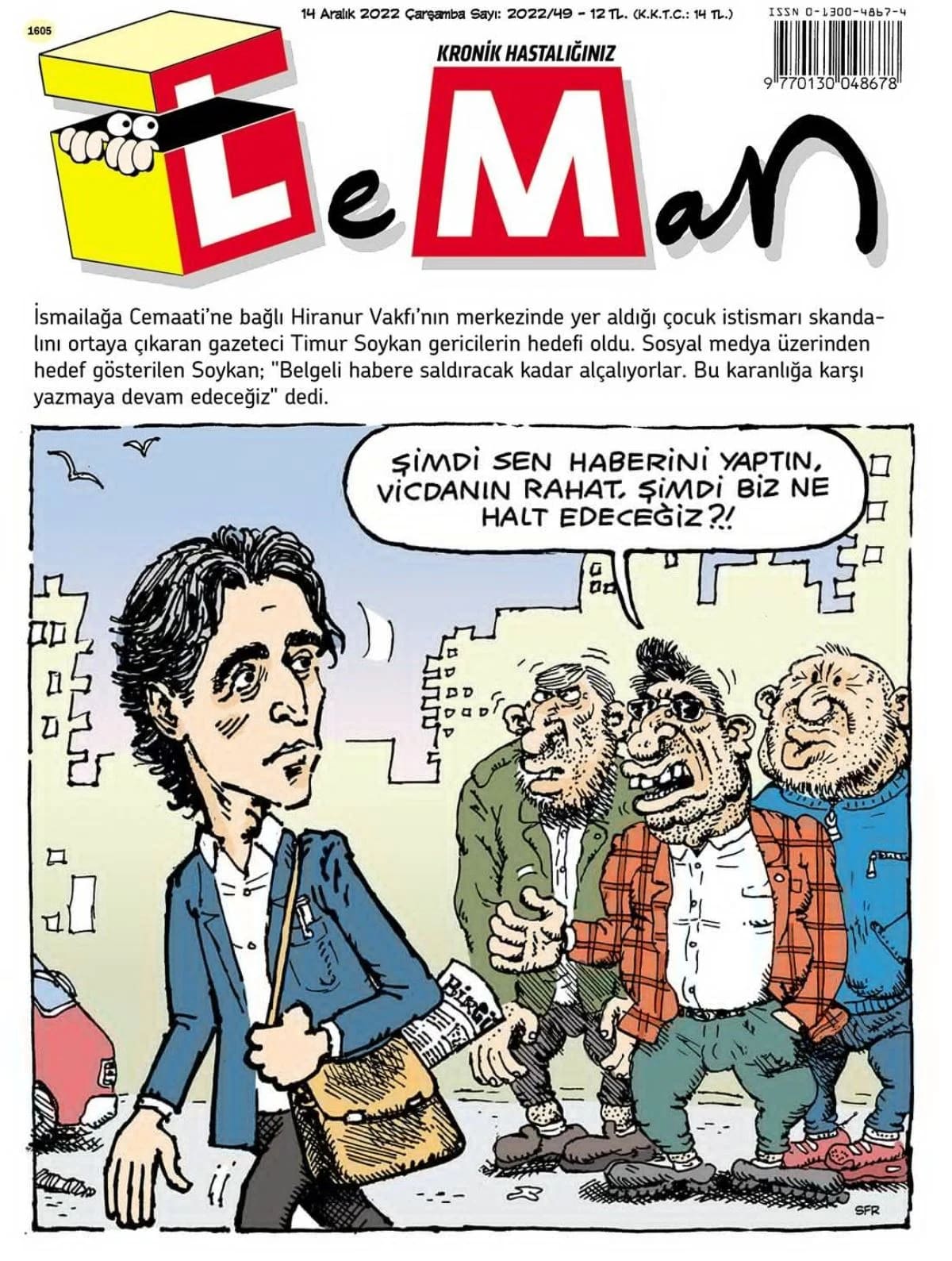 Mizah dergisi LeMan, bu haftaki kapağına Hiranur Vakfı’nın kurucusu Yusuf Ziya Gümüşel’in 6 yaşında imam nikahı ile ‘evlendirdiği’ kızının yaşadığı istismarı ortaya çıkaran gazeteci Timur Soykan’ı taşıdı. Soykan, istismar sakndalını ortaya çıkarmasının ardından gericiler ve aktroller tarafından hedef alınmıştı.