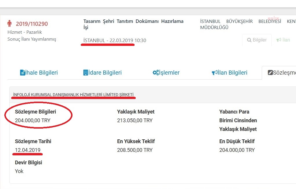 İnfoloji Kurumsal firmasının son aldığı ihalenin tarihi 22 Mart 2019. Bir başka ifadeyle ihale, belediye seçimlerinden 9 gün önce yayıldı. İBB Kentsel Tasarım Müdürlüğü, “Tasarım Şehri Tanıtım Dokümanı Hazırlama İşi” adı altında açılan ihale için, seçimlerden yaklaşık 10 gün sonra, 12 Nisan 2019 tarihinde İnfoloji firmasıyla sözleşme imzaladı. Belediye seçimleri 31 Mart 2019 tarihinde yapılmasına karşın, AKP’nin İstanbul seçimlere yaptığı itirazlar nedeniyle, Ekrem İmamoğlu mazbatasını 17 Nisan 2019 tarihinde alabilmişti.