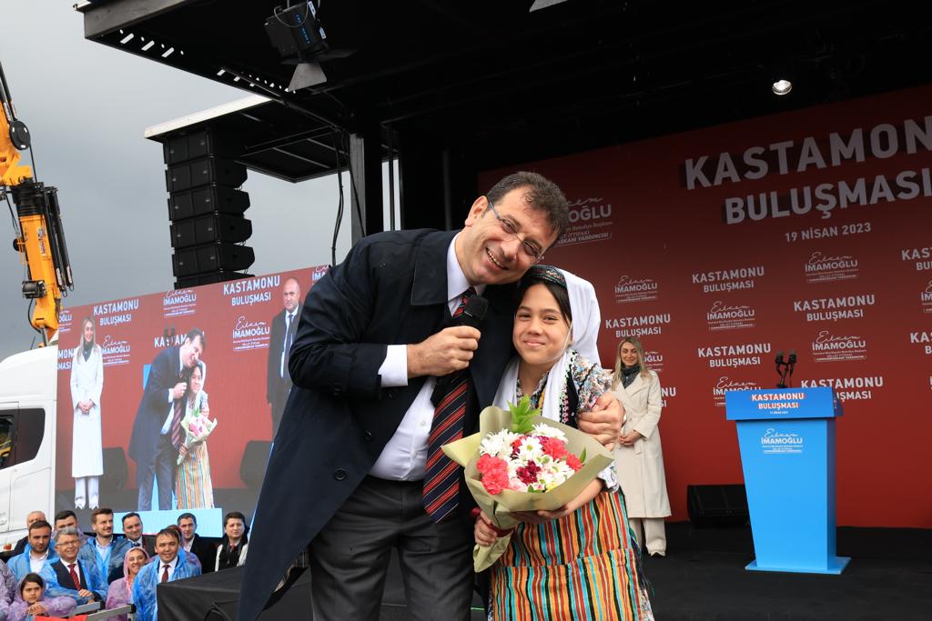 Millet İttifakı’nın Cumhurbaşkanı Yardımcısı adayı ve İstanbul Büyükşehir Belediye (İBB) Başkanı Ekrem İmamoğlu, eşi Dr. Dilek İmamoğlu ile birlikte, Kuzeykent Meydanı’nda Kastamonulularla buluştu. Yağmura ve ardından yağan doluya rağmen alanı dolduran Kastamonulular, İmamoğlu’na sevgi gösterilerinde bulundu. Dolu nedeniyle beyaza bürünen platformda konuşan İmamoğlu, zaman ilerledikçe, vatandaşların “Islana ıslana kazanacağız” tezahüratları eşliğinde önce paltosunu, sonra da ceketini çıkardı. “Memleketin yağmuru da bizim karı da bizim güneşi de bizim, memleketin her güzelliği bizim” diyerek sözlerine başlayan İmamoğlu, Kastamonuluları, “Kahraman Şerife Bacı’nın Kastamonulu kadınlarına, onun torunlarına selam olsun. Memleketimin güzel insanları Rıfat Ilgaz’dan, Oğuz Atay’dan, Behçet Necatigil’den selam olsun hepinize. İstiklal Marşı bestecisi Osman Zeki Üngör’den selam olsun hepinize” sözleriyle selamladı.