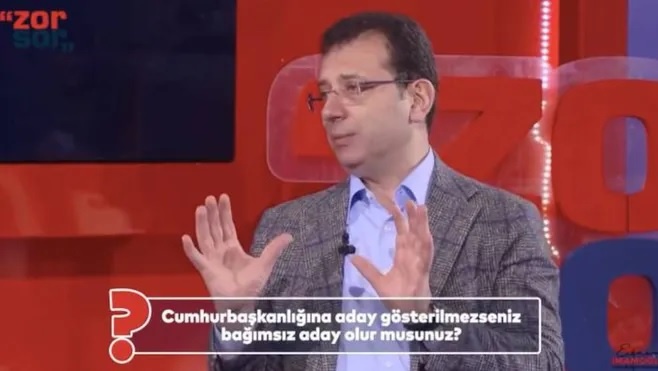 İstanbul Büyükşehir Belediye (İBB) Başkanı Ekrem İmamoğlu, resmi Youtube kanalındaki ‘Zor Sor’ adlı programda gençlerden gelen sorulara yanıt verdi. İmamoğlu, Cumhurbaşkanlığı seçim sürecine ilişkin olarak “Aday gösterilmezseniz bağımsız aday olur musunuz?” sorusuna “Bireysel hedeflerin bu döneme ihanet olacağını düşünüyorum. Doğru kararın günü geldiğinde verilmesinden yanayım.” diyerek cevap verdi.
