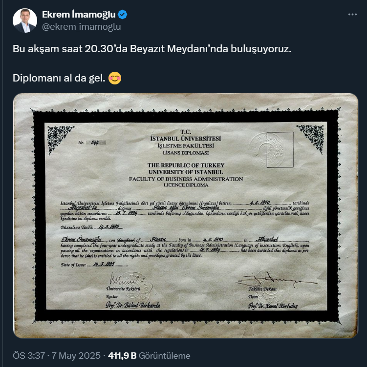İstanbul Üniversitesi’ne ait diplomasını X hesabından paylaşan Ekrem İmamoğlu paylaşımında şu ifadelere yer verdi: Bu akşam saat 20.30’da Beyazıt Meydanı’nda buluşuyoruz. Diplomanı al da gel.