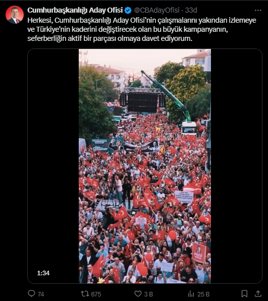 “Herkesi, Cumhurbaşkanlığı Aday Ofisi’nin çalışmalarını yakından izlemeye ve Türkiye’nin kaderini değiştirecek olan bu büyük kampanyanın, seferberliğin aktif bir parçası olmaya davet ediyorum.”