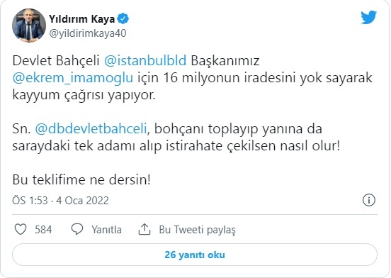 CHP Ankara Milletvekili Yıldırım Kaya, Bahçeli’nin açıklamaların sosyal medya hesabından yanıt verdi.