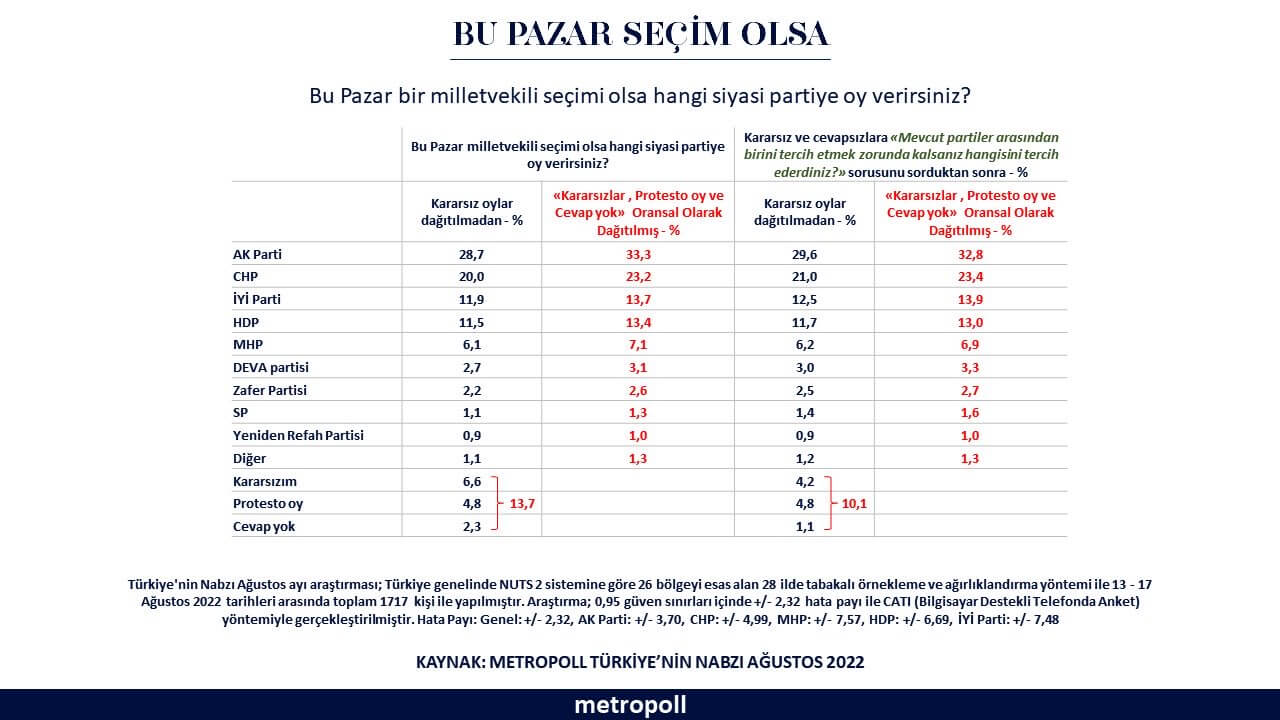 MetroPoll’ün anketinde dikkat çeken diğer bir parti de Zafer Partisi oldu. Zafer Partisi’nin oy oranının yüzde 2.2 olduğu görülürken DEVA Partisi’nin oy oranı yüzde 2.7 olarak açıklandı. Bununla beraber Gelecek Partisi’nin listede yer almaması da dikkat çekti.